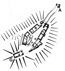 The barbican was built at the beginning of the 14th century and contained a guard-room on the first floor.[46] The barbican contains numerous putlog holes from its construction, although these might have been masked by exterior plasterwork in the medieval period.[47] A passageway led up from the barbican to the gatehouse, probably originally guarded by a drawbridge and containing the accommodation for the castle's constable.[48]