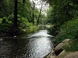 The actual survey was only completed ten months later, on October 10, 1703.[2] Despite Abraham Beaks' request that the band be given land along the creeks, and the order for the surveyors to grant land according to the band's "desire," the land granted to the Okehocking was poor for agriculture and contained only small stretches of Ridley and Crum creeks.[15] The band was cut off from much of Ridley Creek by the land belonging to Charles Whitacre. Whitacre may have conspired with the surveying team to grant primarily hilly land to the Okehocking and exclude them from the most fertile, creekside areas.[16] The tract as measured came to 484 acres (196 ha), less than apportioned to the band but within the margin of error for the time.[17]