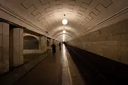 The station was originally planned to be a bi-vault design similar to many London Underground stations, but Lazar Kaganovich, who was in charge of the Moscow Metro project at the time, insisted that the station be changed to a tri-vault design after 20 metres (66 ft) of tunnel had already been bored. A major setback occurred when accumulated rainwater broke through the vault before it had been completely sealed and flooded the station. Though no one was injured in the disaster, construction had to be halted while the damage was repaired.