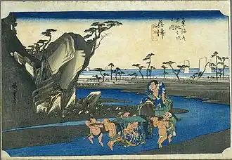 The classic ukiyo-e print by Andō Hiroshige (Hōeidō edition) from 1831–1834 depicts two sumo wrestlers being carried across the Okitsu River, one on a packhorse and the other in a kago.