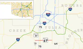 State Highway 67, abbreviated as SH-67, is a 9.94-mile-long (16.00 km) highway on the south side of Tulsa. It begins in the west at U.S. Route 75 Alternate in Kiefer and runs east along 151st St. South before ending at US-64 in Bixby. Along the way it crosses US-75 in Glenpool. It has no lettered spur routes.