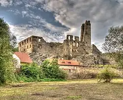 The main landmark of Okoř is the ruin of the large medieval Okoř Castle. It was gradually built from the 13th to the 15th century. During the Thirty Years' War, the castle became a ruin. The last construction modifications took place in the 18th century.[6] Today the castle is a popular tourist destination. In the summer season, various cultural events are held here.[7]