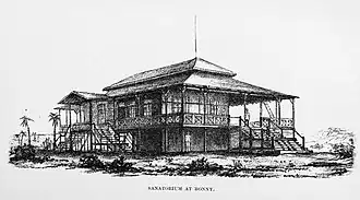 Later in 1885, Jumbo made a trip to England, arriving in Liverpool in May accompanied by two of his sons, Herbert and James. The Times described him as "King of Bonny" when reporting the visit.[12] On his return trip, the ship Corisco he was travelling on was wrecked at the mouth of the River Cess, Liberia, but he managed to escape.[13][14] In February 1886, a protectorate treaty was concluded between Bonny and Britain. A ruling council was established, and King George Pepple was reestablished on his throne. Jumbo was publicly degraded, his bans on Christianity were repealed and afterwards he was a spent force in Bonny politics.[15] In June 1886, refuting rumours that Jumbo had drowned in the shipwreck, a reporter said he had retired 40 miles into the interior, leaving all his affairs in the hands of his son Herbert.[16] In 1887, Jaja was arrested and exiled to Tenerife, dying there in 1891, and his old rival Jumbo died around the same time.[17]