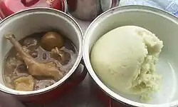 It is a soup made from the Okoho stick which is very slimy after preparation. It is usually prepared with bush meat (such as grass-cutter, alligator and smoked meat etc.) and best served with pounded yam (aka Onihi). It can also be eaten with semolina, eba (made from garri) and yam flour. This soup is usually prepared without the use of oil. It is the most respected and demanded food in all Idoma events such as; traditional weddings, burial ceremonies, birthdays and other festivities. Okoho soup is highly medicinal and also known for its ability to aid digestion.[2] Other Nigerian tribes such as Igbos and Igalas also refer to it as Okoho,[3] while the stick is known as Ajara or Orogbolo by the Yoruba tribes of northern and southern Nigeria. The Hausas usually call it Dafara.[1]