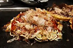 Okonomiyaki (Japanese: お好み焼き; listen) is a Japanese teppanyaki savory pancake dish consisting of wheat flour batter and other ingredients (mixed, or as toppings) cooked on a teppan (flat griddle). Common additions include cabbage, meat, and seafood, and toppings include okonomiyaki sauce (made with Worcestershire sauce), aonori (dried seaweed flakes), katsuobushi (bonito flakes), Japanese mayonnaise, and pickled ginger.