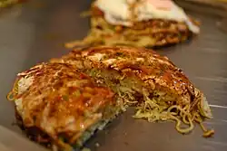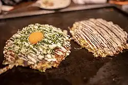 It is sometimes compared to an omelette or a pancake and is sometimes referred to as a "Japanese pizza" or "Osaka soul food".[14][9][15][16] The dish can be prepared in advance, allowing customers to use a teppan or special hotplates to fry after mixing the ingredients. They may also have a diner-style counter where the cook prepares the dish in front of the customers.[17]