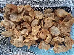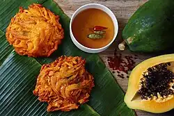 The most basic traditional okoy recipe uses a small amount of galapong (ground soaked glutinous rice) as the batter, spiced to taste with onion, garlic, salt, and scallions. It is mixed with mashed kalabasa (calabaza) and unshelled small shrimp. They are deep-fried as small flat patties until golden brown. Excess oil is drained on paper towels and the dish is served warm and crispy.[5] Okoy batter can also be mixed with kamote (sweet potato) or kamoteng kahoy (cassava), instead of, or in addition to calabaza. Other ingredients are also traditionally added, including mung bean sprouts (togue) and/or julienned carrots, onions, and green papaya.[6][7] The dish is sometimes dyed bright orange with achuete seeds.[1]