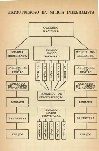 Motivated less by doctrine and more by feelings against communism,[11] which he saw infiltrating the Army in Santa Catarina, in 1932 Mourão joined the Brazilian Integralist Action. The following year, he promoted the movement in Minas Gerais with Plínio Salgado, Olbiano de Melo and Gustavo Barroso. In 1934, the latter became head of the Brazilian Integralist Action Militia's national department, in which Mourão was chief of staff, organizing it along military lines with his knowledge of the EEM. In Santa Catarina (he returned to the 14th BC as deputy commander, from 1936 to April 1937) he had contact with many Integralists – 39 of the 43 municipalities in the state had an Integralist nucleus. In 1937 he entered the Chamber of the Four Hundred, the advisory body of the national leadership of the AIB.[12][13]