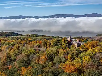The Olana Viewshed comprises panoramic views that begin in the Hudson River Valley and extend toward Massachusetts, Vermont, and Connecticut. To the west, the ridge of Sieghenburgh drops off abruptly, offering a view of the Hudson River through a series of native trees planted by Frederic Church in the nineteenth century. West of the Hudson River the eastern range of the Catskill Mountains can be viewed. To the southwest and south the terrain descends to Quarry Hill directing the eye three miles away toward Inbocht Bay. To the southeast and east Blue Hill rises in the distance. In 1876 a New York journalist reported "There are no finer views in the world than he can command from his windows."[22] Church spent over thirty years meticulously designing the landscape—including the excavation of an artificial lake in 1873 to mirror the Hudson and add balance to the viewshed—meanwhile producing dozens of oil sketches of the view from Olana.[23] The property on Long Hill was purchased by Church because of its grand views: "To his skeptical father (who was financing the purchase), Church argued that the lot was important in 'securing fine openings for the views.'"[24]