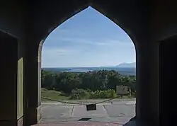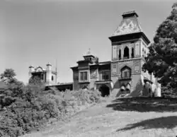 Olana is one of the few intact artists' home-, studio- and estate-complexes in the United States; it was designated a National Historic Landmark in 1965.[1][3] The house is also a prime example of Orientalist architecture.[2] It is owned and operated by the New York State Office of Parks, Recreation and Historic Preservation, and is also supported by The Olana Partnership, a non-profit 501(c)(3) organization.[4] The main building is an architectural masterpiece designed by Frederic Church in consultation with the architect Calvert Vaux.[1][5][6] The stone, brick, and polychrome-stenciled villa is a mixture of Victorian, Persian[3] and Moorish styles.[7] The interior remains much as it was during Church's lifetime, exotically furnished and decorated with objects from his global travels, and with some 40 paintings by Church and his friends. The house is intricately stenciled inside and out; Church designed the stencils based on his travels in the Middle East. The house contains Church's last studio, built as an addition from 1888 to 1890.