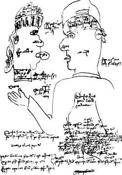 The notes of Olaus Johannis Gutho include this sketch of Aristotle and the medieval scholastic philosopher Albertus Magnus debating.[1]