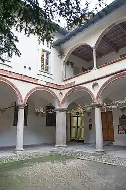 The two courtyards were modified between 1661 and 1671, based on a project by Giovanni Ambrogio Pessina, who also worked on the Fabbrica del Duomo of Milan.[4]