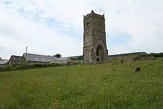 The only parts of the 14th-century church which remain are from the lowest courses of the nave and chancel, and the tower,[2] which has three stages and was unbuttressed,[1] however a buttress was added to the south east corner in the 19th century.[1] The tower was made safe in 1973.[4]