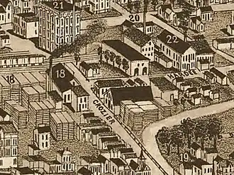 In 1869, Knoxville's two main rail lines merged to form the East Tennessee, Virginia and Georgia Railroad, which in subsequent years constructed or acquired over 2,500 miles (4,000 km) of track across the southeast, leading to a wholesaling and industrial boom in the city.[5] By 1886, several factories had moved into the Old City. The Burr and Terry Sash Factory stood at what is now the intersection of Central and Jackson.[8] The four-story City Mills (later White Lily) plant and the Beach's Marble Works finishing mill stood along Depot, and the Elridge Carriage Factory operated near the modern corner of Central and Summit Hill.[8]