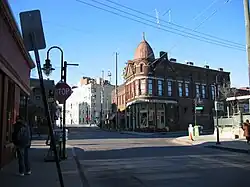 The arrival of the railroad had a major impact on the city's cultural makeup, as hundreds of Irish immigrants arrived in town to help construct the railroad tracks and facilities. Many of these immigrants settled in what is now the Old City, so much so that at one point the area was known as "Irish Town."[6] After the Civil War, Irish businessmen began building saloons and shops along Central (originally Crozier) Street that served the city's railroad traffic. Among these businesses was a saloon built by Patrick Sullivan (1840—1925), which initially operated out of a wooden structure before Sullivan erected the elaborate brick building that still stands at the corner of Central and Jackson.[7]