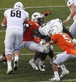 On September 22, 2018, ODU defeated Virginia Tech 49–35. Jeremy Cox (pictured, No. 35) rushed for 130 yards, including a 40-yard run that sealed the win late in the fourth quarter.[21]