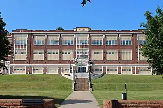 The projecting central block is nine bays wide, containing the four-door main entrance in the center bay in a projecting vestibule. The entrance is flanked with brick buttresses and topped by a parapet containing a plaque reading "A.D. 1923." The entrance opening is a compound Tudor arch with a transom above containing pointed arch tracery. Above the main entrance is a four-part horizontal compound window on the first floor, an eight-part compound window on the second, and a sixteen-part compound window on the third.[2]