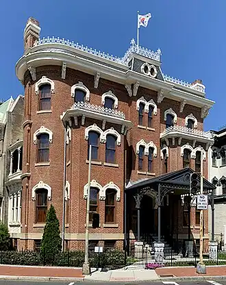 On December 16, 1877, Seth Ledyard Phelps was issued a permit to construct a seven-bedroom home at 15 Iowa Circle[a], a park and traffic circle in the present-day Logan Circle neighborhood of Washington, D.C.[1][2] Thomas M. Plowman was selected to design the 6,300-square-foot (590 m2) brick residence and it was built by Joseph Williams at a cost of $5,500 (equivalent to $160,000 in 2024[3]).[4] It was adorned with a tin roof, decorative railing, cast metal porch, and Ohio sandstone, and included a basement and projecting bays.[1][5][6] Phelps was a military officer who served in the Navy during the Mexican–American War and Civil War, and during his later years was president of the local Board of Commissioners and minister to Peru.[4]
