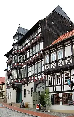 The building has a solidly built ground floor above which rise three timber-framed storeys whose facade is asymmetrically designed. The two uppermost storeys are jetties, i.e. storeys that project beyond the one below. The top storey has inflexed arches. One feature of the building are its polygonal oriel windows. These oriel windows, also built in a timber-framed style, are supported on decorated corbels and project out over the eaves of the house. The building is covered with a steeply pitched gable roof. The main entranceway is designed as a semi-circular arch and has Late Gothic mullions. The house measures 23.5 metres high, is 18 metres wide and 14 metres deep.