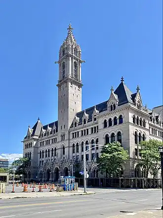 The highly ornamented Gothic Revival style four-story building features a 244 feet (74 m) tall tower over the central entrance.[2][3] Other key architectural details of the building include recessed arches, projecting gargoyles, and a green Ludowici tile roof.[4]