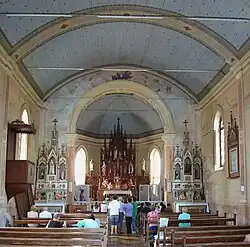 The interior has a single nave and a chancel at the back with a predominance of the neo-Gothic style. The entrance is located under a wooden choir supported by two slender octagonal columns and decorated with simple paintings (Saint Cecilia, King David with the psaltery and another unidentified saint) in three medallions along the parapet. Also under the choir are two wooden confessionals, one on either side of the entrance.[2]