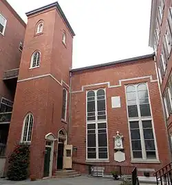 The church structure is nearly impossible to see from the street. One story relates that Benjamin Franklin advised Father Greaton to protect the church, since religious prejudice existed in the largely Quaker city at the time.[9] The front wall of the church is a party wall to a neighboring structure and so provides no means of entry. The entrance from Willings Alley remains through a narrow arch with iron gates, which opens to an unassuming courtyard that conceals the nature of the church building.[4] (On two occasions, in 1740 and 1755, Quakers helped defend St. Joseph's original chapel to prevent Protestant mobs from destroying it.)[10][11] Today the only entrances to the sanctuary are on either side, toward the back of the church, because there are unrelated buildings before and behind the church building on Walnut and Fourth Streets.