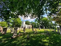 The church is surrounded by a pioneer cemetery with many notable grave sites both nationally recognized and locally significant. The oldest grave site is that of Daniel Rapelje’s son George in 1819;[9] the newest are modern. Nationally significant sites include that of Judge Hugh Richardson, who in 1885 sentenced Louis Riel to death. Locally significant folklore tells of the story of the "witch’s grave" (in fact, the grave of a woman named Maria Baldwin, who died in 1863, and who was not in life accused of witchcraft),[10] the Irish family curse of the Chisholm family where 7 family members died within 7 years,[11] and that of Canadian soldier Octavius Wallace, who fought in the American Civil War as a corporal of the 2nd Michigan Volunteer Infantry, and died at the Battle of Williamsburg in 1862.[12][13]