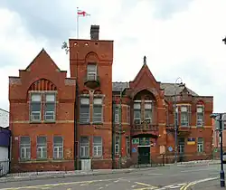 The building was designed as the headquarters of the 7th Lancashire Rifle Volunteer Corps and completed in 1887. This unit evolved to become the 3rd Volunteer Battalion, The Manchester Regiment in 1888 and the 9th Battalion, The Manchester Regiment in 1908.[1] The battalion was mobilised at the drill hall in August 1914 before being deployed to Gallipoli and, ultimately, to the Western Front.[2] Follow the cut-backs in 1967, the presence at the drill hall was reduced to a single company, C (Manchester) Company, 2nd Battalion, Lancastrian Volunteers in 1971; this unit evolved to become C Company, 4th (Volunteer) Battalion, The Queen's Lancashire Regiment in 1975 and C Company, 5th Battalion, The Royal Regiment of Fusiliers in 1986.[3] The Ministry of Defence made the decision to dispose of the building in 2013;[4] this decision was later reversed, and the building continues to be used by the cadet forces.[5]