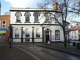 In the early 19th century, as part of measures to improve the Worcester to Bromsgrove Turnpike Road which passed along St Andrews Street, civic leaders decided to demolish the Exchequer Building and replace it with a new building slightly to the west of the original building.[5] The new building was designed in the neoclassical style, built in red brick with stucco facing and was completed in 1826.[1] It was arcaded on the ground floor so that markets could be held, with an assembly room on the first floor.[1] The design involved an asymmetrical main frontage with five bays facing onto St Andrews Street with the right hand bay curving round into Friar Street; the St Andrews Street elevation featured Doric order columns on the ground floor and round headed sash windows with moulded architraves on the first floor.[1] The original windows featured fine tracery[6] and there was a cornice and parapet at roof level.[1] The pillory and stocks were kept in front of the town hall.[7]