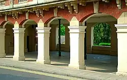 After the market hall became dilapidated, civic leaders decided to demolish the old building in sections: the central and north sections of the old structure were demolished in 1851.[3] The new building (the central section of the current structure) was designed by George Low in the Jacobean style, built with red brick and stone dressings and completed later that year.[1] The design involved a symmetrical main frontage with five bays facing onto the High Street; the middle bay featured a portico with Corinthian order columns supporting a balcony and a bay window on the first floor with a gable above.[1]