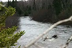 The river follows a fault which became a spillway for glacial meltwater following the last ice age. The river's valley has extensive deposits of sand and gravel. At its mouth, the river bends sharply behind a beach berm, that has formed as a result of prevailing westerly winds, which in turn causes lake waves to dam the river's mouth with sand.[2]
