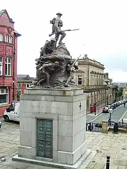 Oldham War Memorial is a war memorial in Oldham, England, comprising a large bronze sculpture group on a granite plinth. It was built to commemorate the men of Oldham who were killed in the First World War. Bronze plaques on the wall of the churchyard nearby list the fallen, including Mabel Drinkwater, a nurse who died after an operation at Oldham Royal Infirmary. A mechanised roll of honour was added in the 1950s, listing the men from Oldham who were killed in the Second World War. The memorial became a Grade II listed building in 1973. The listing was upgraded to Grade II* in December 2016.