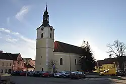 The Church of Saint Lawrence on the town square was originally a wooden church from 1391. The wooden church was burned down by the Hussites in 1424 and a new Gothic stone church was built in 1426. After the fire in 1827, the current structure was built in 1831–1839.[7]