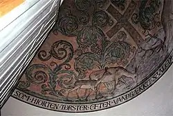 Another important aspect of Søndergaard's work was church decoration. On assignments for the National Museum of Denmark, he participated in the restoration of frescos in the churches of Lyngby, Ballerup, Måløv, Vallensved and Vallensbæk, as well as the cathedrals of Aarhus and Roskilde. He also decorated a number of Danish churches including the Church of Our Saviour, Esbjerg, (1929), St John's, Vejle, (1934), Jerslev Church (1944),[2] and the apse vault of Sct Nikolai Church in Holbæk (1930).[3]