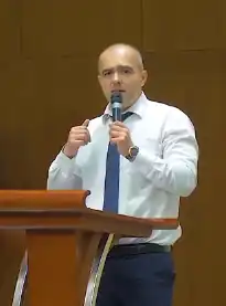 Oleg Sergeevich Gaidukevich or Alyeh Syarhyeyevich Haydukyevich[a] (born 26 March 1977) is a Belarusian politician, lawyer and policeman who has been the chairman of the Liberal Democratic Party of Belarus since 2019, succeeding his father Sergei Gaidukevich.