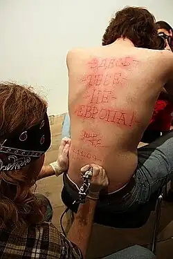 - ^ "Осужденный украинский блогер татуировочной машинкой выбил на спине фразу, услышанную на допросе". Korrespondent (in Russian). Kyiv: KP Media. 2 October 2010. Retrieved 23 December 2021.