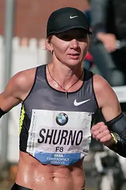 Moving away from her typical racing grounds in the United States, she competed at the high calibre Nagoya Women's Marathon in Japan in March 2012 and improved her best by almost three minutes, coming seventh in 2:25:49.[9] She was overlooked for the Ukrainian Olympic team and Tetyana Hamera-Shmyrko set a national record at the event.[10] This mark did not stand for long as a month later Shurkhno ran a new Ukrainian record time of 2:23:32 hours to place third at the 2012 Berlin Marathon.[11]