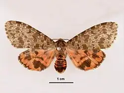 Head and thorax dark grey-brown; collar fringed with crimson and with a pair of pale-ringed black spots; tegulae with two pairs and vertex of thorax with one similar spot; abdomen crimson, with a series of short dorsal black bands and lateral spots. Fore wing fuscous brown, with very numerous pale-ringed black spots in the interspaces. Hind wing crimson, with antemedial, medial, postmedial, and marginal bands and more or less conjoined blotches.