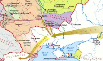 Oleshia[5] or Oleshye[a] is the name of a former settlement and a historic area on the lower Dnieper. During its existence, the port settlement was controlled by Kievan Rus', and was an important center of fishing and trade due to its location on the route from the Varangians to the Greeks.[5] In May 1223, the Rus' princes Danylo and Mstislav defeated the Mongols during Battle of Oleshia.[7]