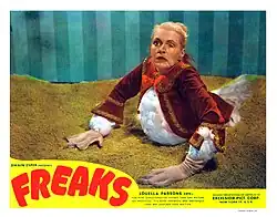 The introduction of talking films proved difficult for Baclanova due to her heavy Russian accent. She no longer secured leading roles, and was relegated to supporting parts. Her career was in decline when she was offered the role of the cruel circus performer Cleopatra in Tod Browning's film Freaks[7] (1932). This horror movie, which featured actual carnival freaks, was highly controversial and screened only briefly before being withdrawn. It would be 30 years before Freaks gained a cult following. The movie did not revive Baclanova's film career, which ended in 1943.