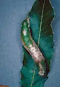 The larvae feed on the leaves of Fagus, Castanea and Quercus species.[2]