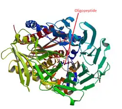 The history of oligopeptidases originates in the late 1960s, when the rabbit brain was searched for enzymes that cause inactivation of the nonapeptide bradykinin.[5] In the early and mid 1970s two thiol-activated endopeptidases, responsible for more than 90% of bradykinin inactivation, were isolated from cytosol of rabbit brain, and characterized.[6][7] They correspond to EOPA (endooligopeptidase A, EC 3.4.22.19), and Prolyl endopeptidase or Prolyl oligopeptidase (POP) (EC 3.4.21.26). Since their activities are restricted to oligopeptides (usually from 8-13 amino acid residues), and do not hydrolyze proteins or large peptides (>30 amino acid residues), they were designated oligopeptidases.[8] In the early and mid 1980s other oligopeptidases, mostly metallopeptidases, were described in the cytosol of mammalian tissues, such as the TOP (thimet oligopeptidase, EC 3.4.24.15),[9] and the neurolysin (EC 3.4.24.16).[10] Earlier on, the ACE (angiotensin-converting enzyme, EC 3.4.15.1), and the NEP (neprilysin, EC 3.4.24.11), had been described, at the end of the 1960s,[11] and in 1973,[12] respectively.