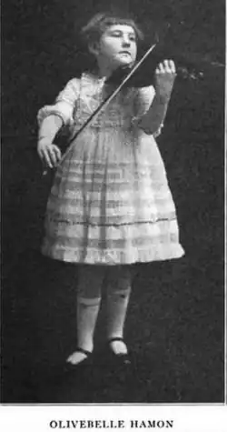 Olivebelle Hamon was famous from a very early age as a violinist in Chicago,[4] a standout student of Rudolph Reiners.[5] In 1922 she gave a stunt recital, playing her violin while walking up and down 33 floors of external stairs at the Wrigley Building,[6] as a benefit for Camp Algonquin, a YMCA "fresh-air" camp on the Fox River.[7]