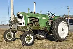 A three-number sequence was introduced in 1958 with the Oliver 770. The new line was more squared-off in appearance, retaining the green body and replacing previous models' yellow and red highlights with a green-tinged white for grilles and wheels. The engines remained the same, with a slightly higher RPM and compression ratio, yielding about 10% more power. The transmission was offered with a torque amplifier. During this time Oliver, Cockshutt and White were combined, and the 770 was sold as the Cockshutt 770 in Canada.[11] The 770 was produced until 1967, by which time the Oliver brand was absorbed into White. The 1967 price was about $4,345.[12][13] Oliver produced an industrial version of the 770 from 1958 to 1967.[14]