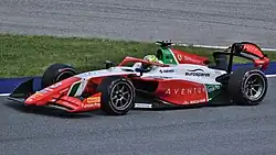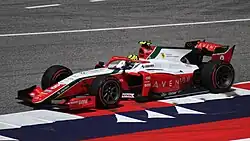 Bearman ended sixth in qualifying at Melbourne, despite an early crash.[101] In a sprint race where he battled many of his rivals, he secured seventh.[102] However, in the feature race, Bearman's race came undone when he tangled with Isack Hadjar in the pits, sustaining a puncture. He had to pit again and had a trip to the gravel later on, finishing 17th.[103] Bearman claimed his maiden pole position the next round in Baku in dramatic circumstances, managing to set the fastest lap despite a shunt just minutes before the end of the session resulted in his steering wheel pointing slightly to the right.[104][105] Starting the race ninth after a grid penalty for Pourchaire,[106] Bearman came through the field to move up to fourth by lap 1. In the closing stages, leaders Dennis Hauger, Victor Martins and Jehan Daruvala crashed out in turn 1 following a late safety car restart. After navigating around the pileup, Bearman capitalised on a mistake by teammate Vesti to take the lead before the race was neutralised once more, becoming the second youngest race winner in Formula 2.[107][108] The following day, the feature race, Bearman claimed victory and became the ninth driver in GP2 and Formula 2 history to do "the double" and only the fourth as a rookie.[109][110]