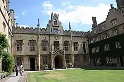 Cromwell's head remained there until at least 1684.[3] Although no firm evidence has been established for the head's whereabouts from 1684 to 1710,[4] tradition says that on a stormy night in the late 1680s, it was blown off from the top of Westminster Hall, thrown to the ground, and picked up by a sentry who carried it home.[4][5][b] After its disappearance from Westminster, it was in the hands of various private collectors and museums until 25 March 1960, when it was buried at Sidney Sussex College in Cambridge, Cromwell's alma mater.