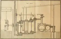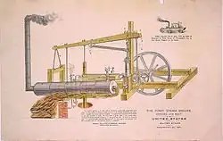 The book begins with an introductory discussion of the principles of steam engines and the relevant physical principles, as well as designs for the Evans high-pressure steam engine, boilers, screw-mills and others.[70] Evans developed a similar suite of tools and tables for potential steam engineers as he had for potential millers, such as tables itemizing the heat and pressure tolerances of various metals, instructions for assembling the basic components of a steam-powered system, and schematics for useful components such as valves and boilers. Evans also used the book to justify the safety of high-pressure steam engines if properly constructed, despite the fact that by this time Evans himself had experienced several boiler explosions in his workshop.[71] However, thermodynamics were little understood in his time. As such, many of Evans's theoretical contentions, including the 'grand principle' of steam he develops to guide the mathematical modelling of pressure and fuel in steam engines, were substantially flawed. Although Evans was to be quite successful in the development of high-pressure steam engines (and his designs were widely used), his theoretical understanding of them was limited and he was generally unable to accurately predict the inputs and outputs of his machines.[72] The guide also indulged in a far wider range of topics of interest to Evans, including a compendium of inventions from others which he deemed to be worthy of further circulation—such as a straw-cutter and flour press developed by his brother Evan, and a horse-drawn scraper and earth mover invented by Gershom Johnson.[73] Evans also used the opportunity to encourage government sponsorship of research: