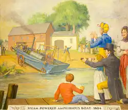 Despite this setback, within a year Evans had found a client. The Philadelphia Board of Health was concerned with the problem of dredging and cleaning the city's dockyards and removing sandbars: in 1805 Evans convinced them to contract him to develop a steam-powered dredge. The result was the Oruktor Amphibolos, or "Amphibious Digger". The vessel consisted of a flat-bottomed scow with bucket chains to bring up mud and hooks to clear away sticks, stones and other obstacles. Power for the dredging equipment and propulsion was supplied by a high-pressure Evans engine.[59] The end result was a craft nearly thirty feet long, twelve feet wide and weighing some seventeen tons. To move this ungainly hulk to the waterfront, as well to give a demonstration of his long-held beliefs in the possibility of land-based steam transportation, Evans mounted the hull on four wheels (twice, as the first set collapsed under the weight) and connected the engine to them in order to drive the Oruktor from his workshop through the Philadelphia streets on the way to the Schuylkill River on July 13, 1805.[60] The Oruktor Amphibolos is thus believed to have been the first automobile in the United States, and the first motorized amphibious craft in the world.[61][62] However, very few contemporary accounts of the craft survive, and Evans's tendency to exaggerate its success in his own annals make verification of its performance difficult. Although Evans himself claimed it proceeded successfully around Philadelphia (and circled his erstwhile rival Benjamin Latrobe's Philadelphia waterworks) before launching into the river and paddling at speed to Philadelphia harbor; the great weight of the craft make land-propulsion based on its limited engine capacity and jury-rigged power train fairly improbable over any significant distance.[63] It is similarly unknown how well, if at all, the Oruktor functioned as a steamboat, and Evans's claims on this point vary significantly over the years. Nevertheless, it is known that the invention proved ineffective for its ostensible purpose as a dredger, and it was scrapped for parts by the Board of Health in 1808.[63] Nevertheless, Evans's ideas of steam carriages were not an impossible dream.[64] Evans would continue to promote the idea. In 1812 he published a futuristic description of a world connected by a network of shipping lines railroad tracks and steam locomotives, accurately describing what will happen in the future. long before any such potential could be realized: