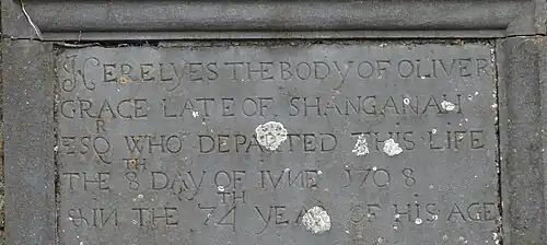 Oliver Grace, of Shanganagh (now Gracefield), was chosen in 1689 as the representative in Parliament of the borough of Ballynakill, in the Queen's County, Ireland.[1] Oliver Grace died on 8 June 1708 and is buried in the south wing of Arles Church (or Grace's Chapel) of which he was the founder.[2]