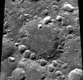 In comparison to the rim, the interior floor is nearly flat and smooth. The most notable impact is a small craterlet near the northern rim. There are a few tiny craterlets scattered about, but nothing of significance. The crater lacks a central peak, and the only irregularities lie along the edge of the inner wall.